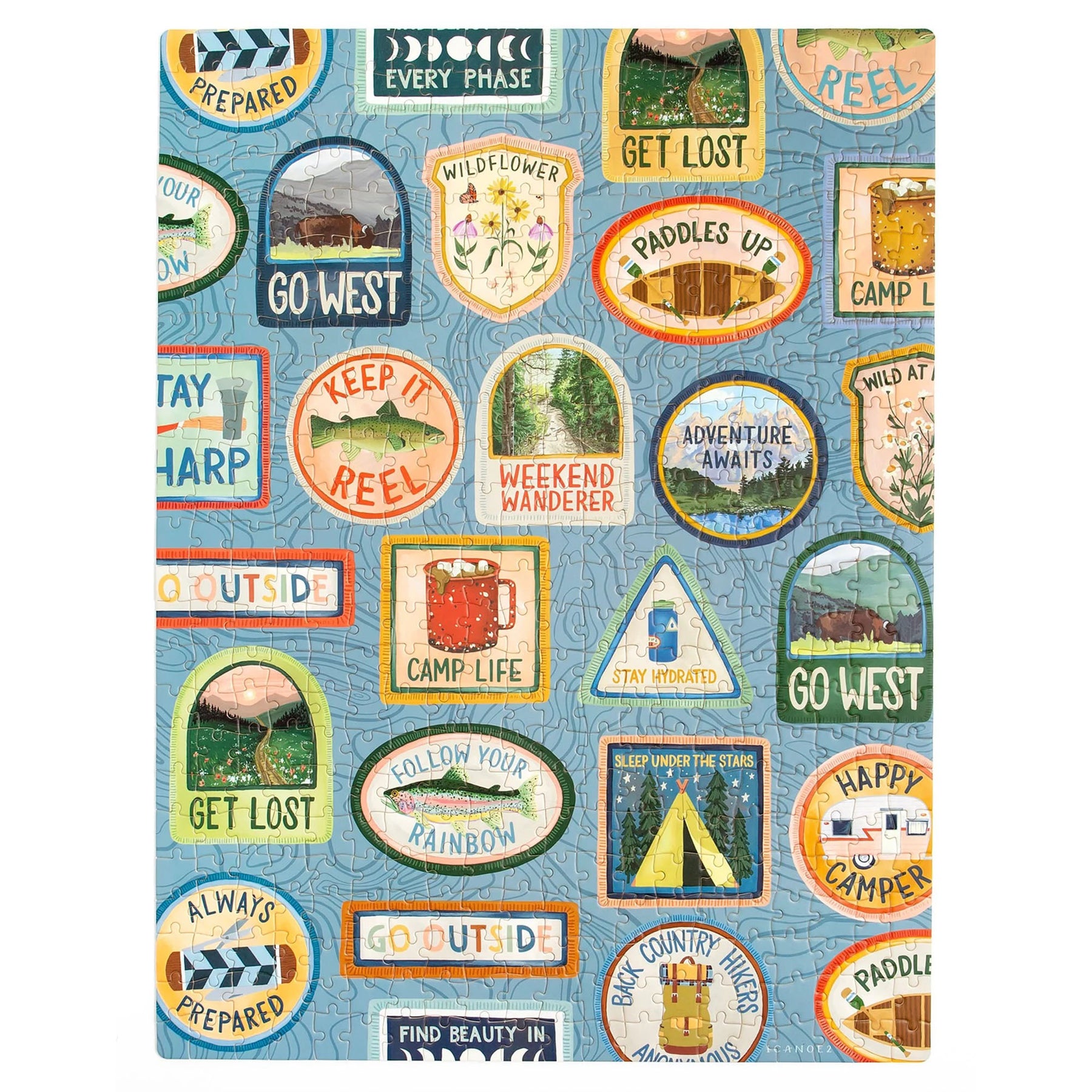Against a topographic map background, this puzzle features decal patches with illustrations that include Be Prepared, Keep it Reel, Go West, Wildflower, Get Lost, Paddles Up, Go Outside, Camp Life, Weekend Wanderer, Adventure Awaits, and more.