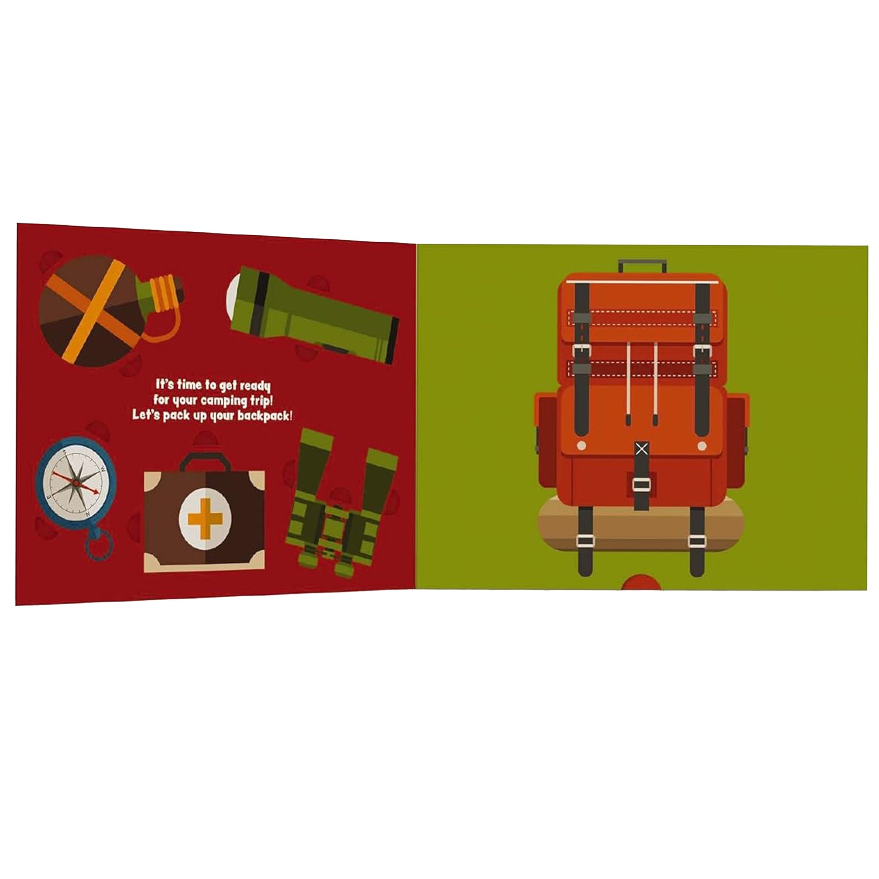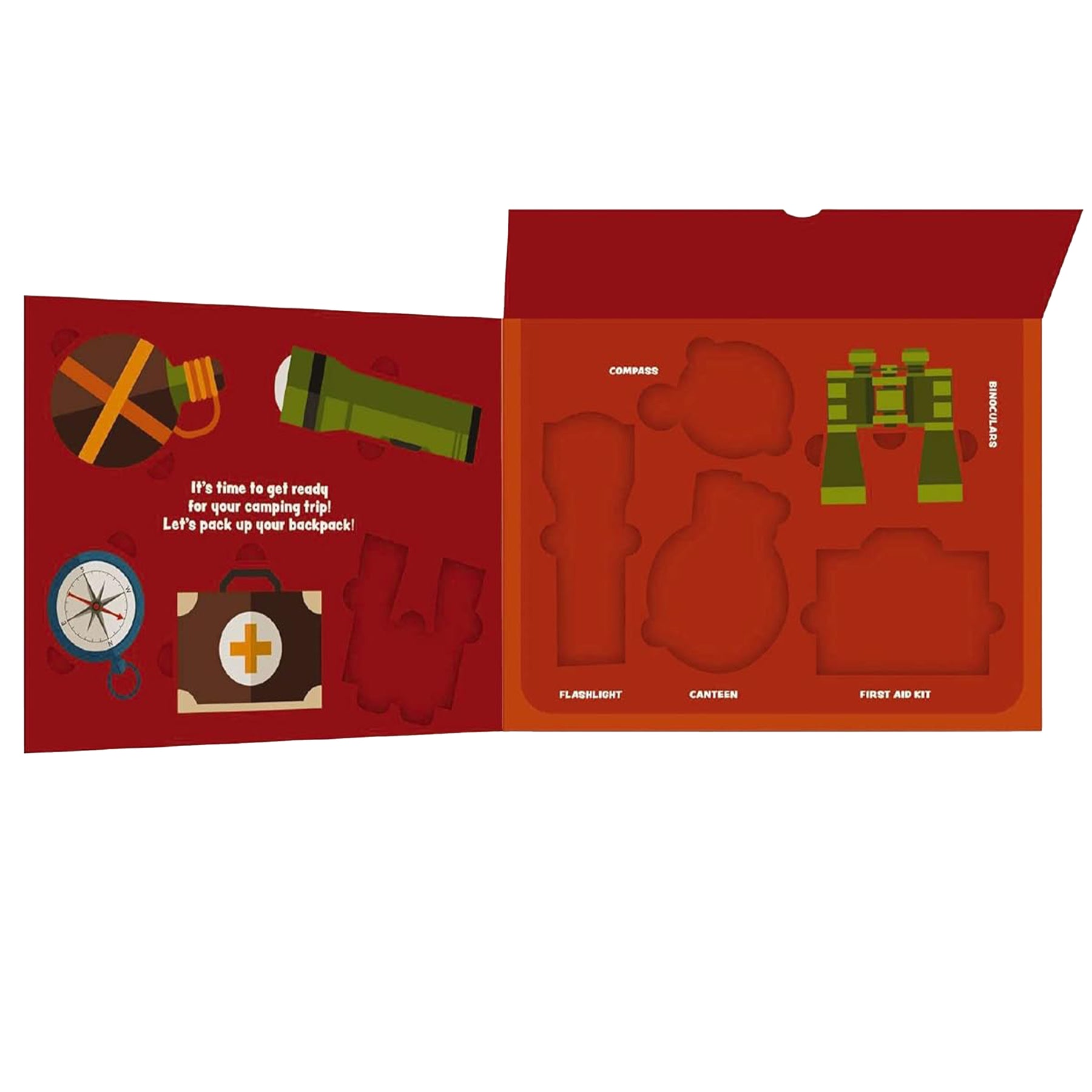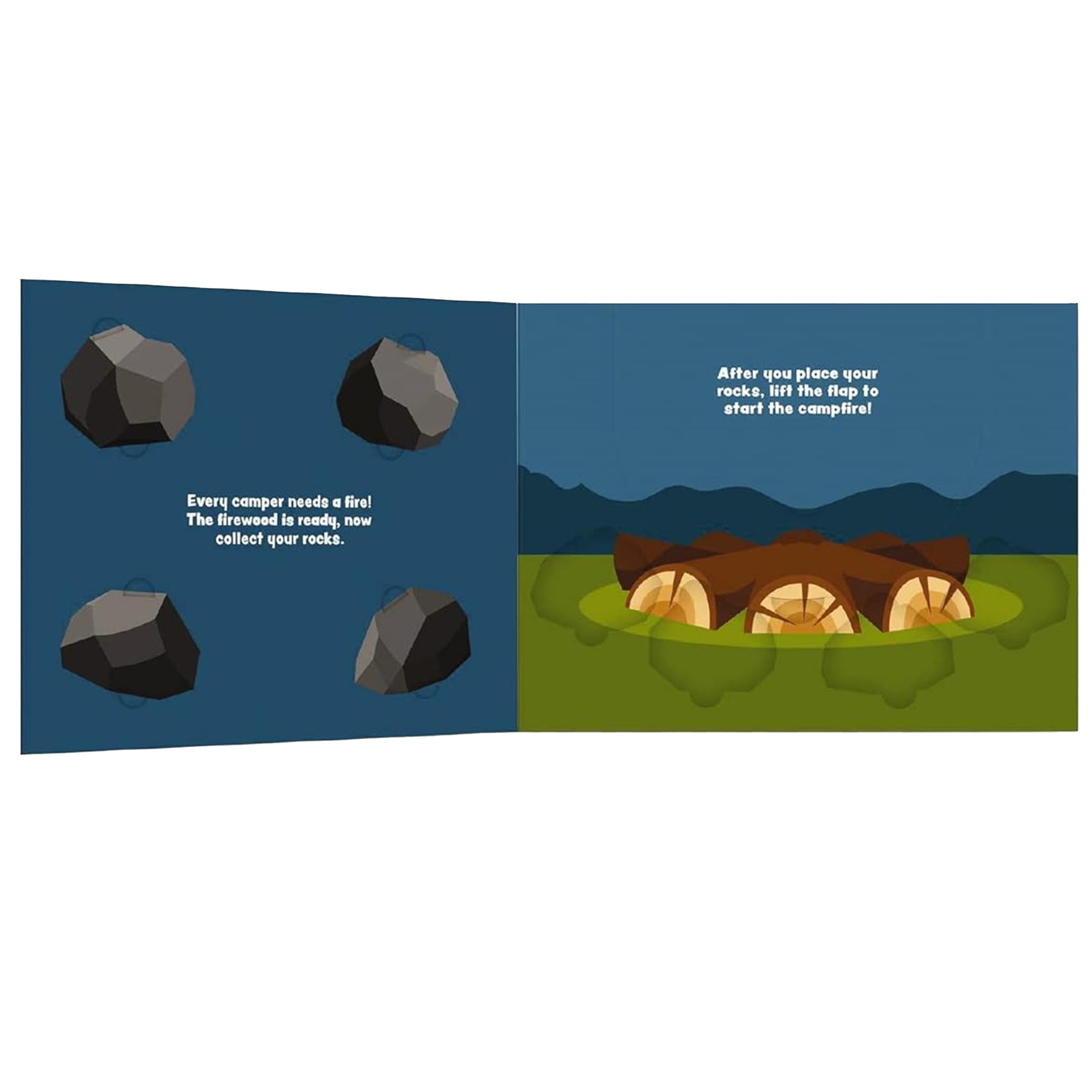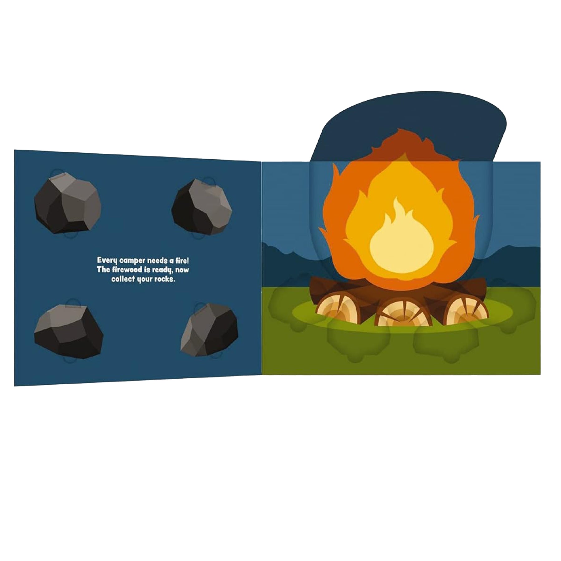 Lift-the-flap peekaboo panels and removable cardboard cut-outs that pop up, including rocks for your campfire, flashlight, medical kit, and more